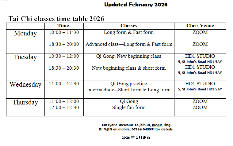 Tai Chi classes time table 2025